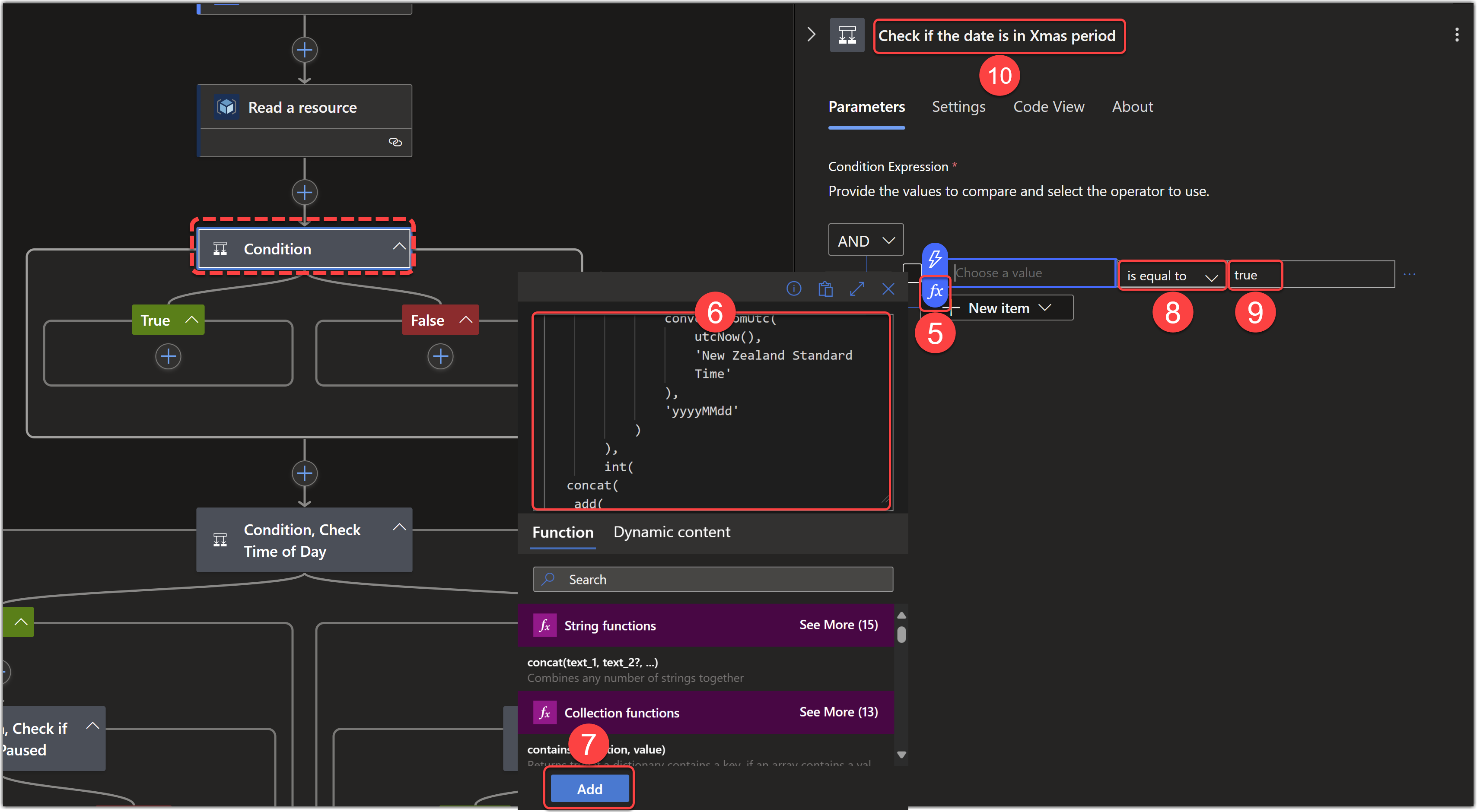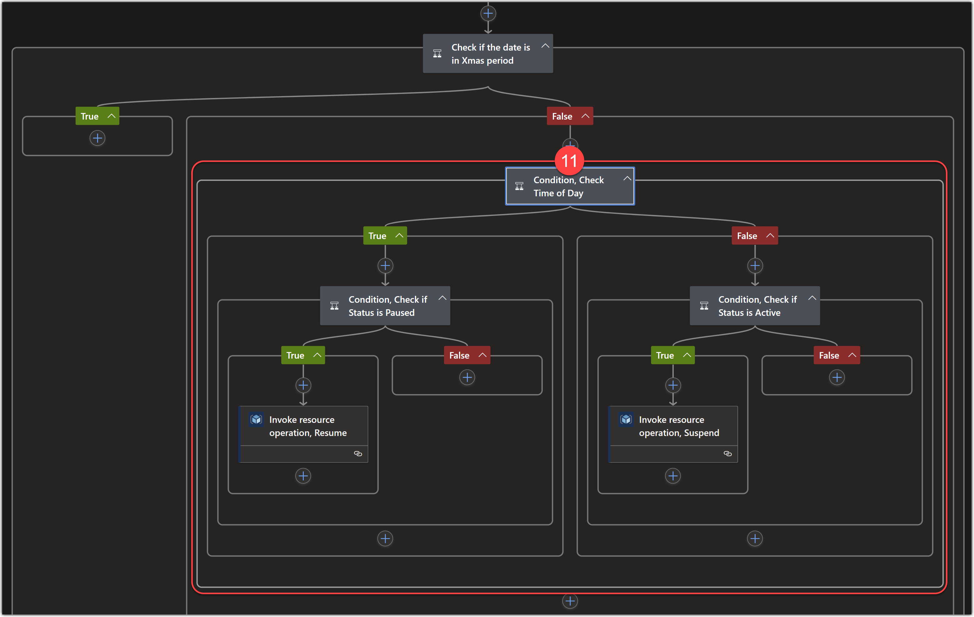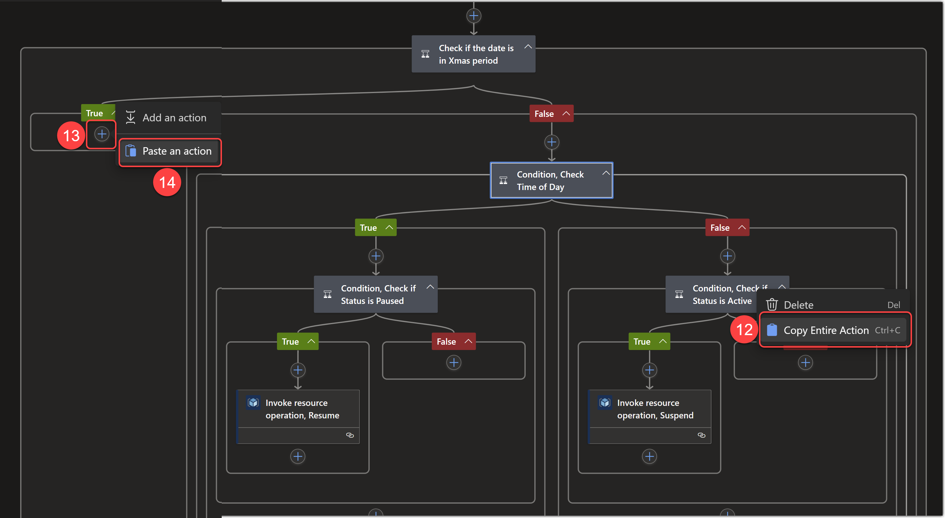 - Click the (+) button on the True condition action of the Check if the date is in Xmas period condition